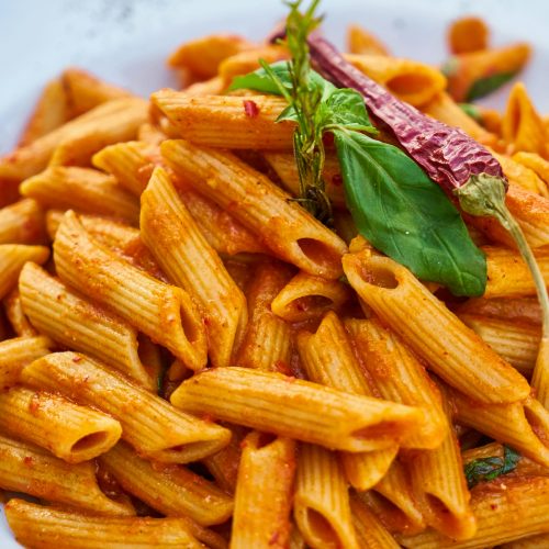 • Cook the penne pasta according to the package instructions until al dente. Drain and set aside.